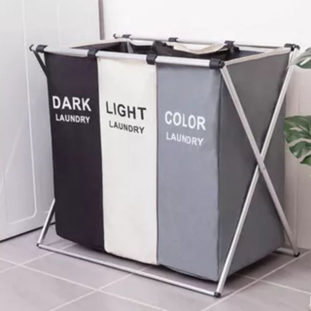 Cesto de ropa sucia con 3 compartimentos para separar blancos, colores y oscuros. Diseño plegable, resistente y fácil de transportar. ¡Más orden y menos estrés en tu hogar!
