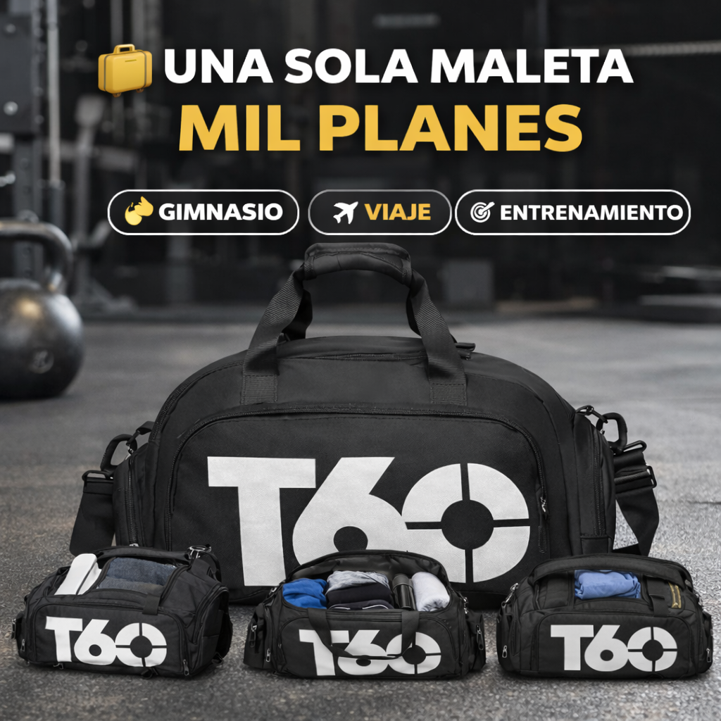 La Maleta Deportiva T60 es ideal para gimnasio, entrenamiento diario y viajes cortos ✈️. Puedes llevar ropa, zapatos, toalla y accesorios sin problema.