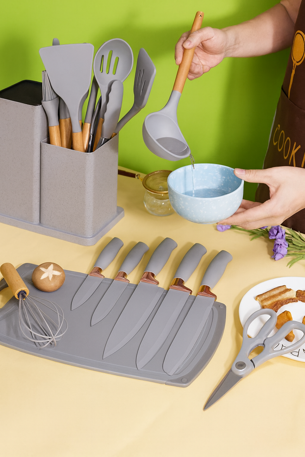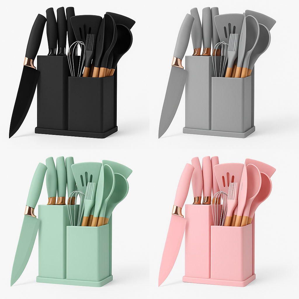 Combina funcionalidad, estilo y resistencia en un solo set. Su diseño moderno y colores elegantes elevan el look de tu cocina mientras te facilitan cada preparación. Ideal para quienes aman cocinar y cuidar los detalles.