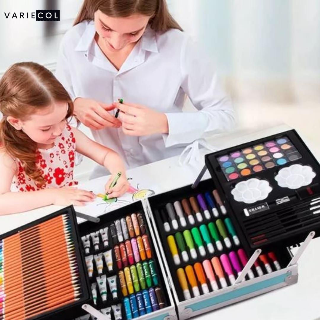El kit incluye lápices de colores, acuarelas, pasteles al óleo, marcadores, pinceles, paletas de plástico, borradores, sacapuntas y más.