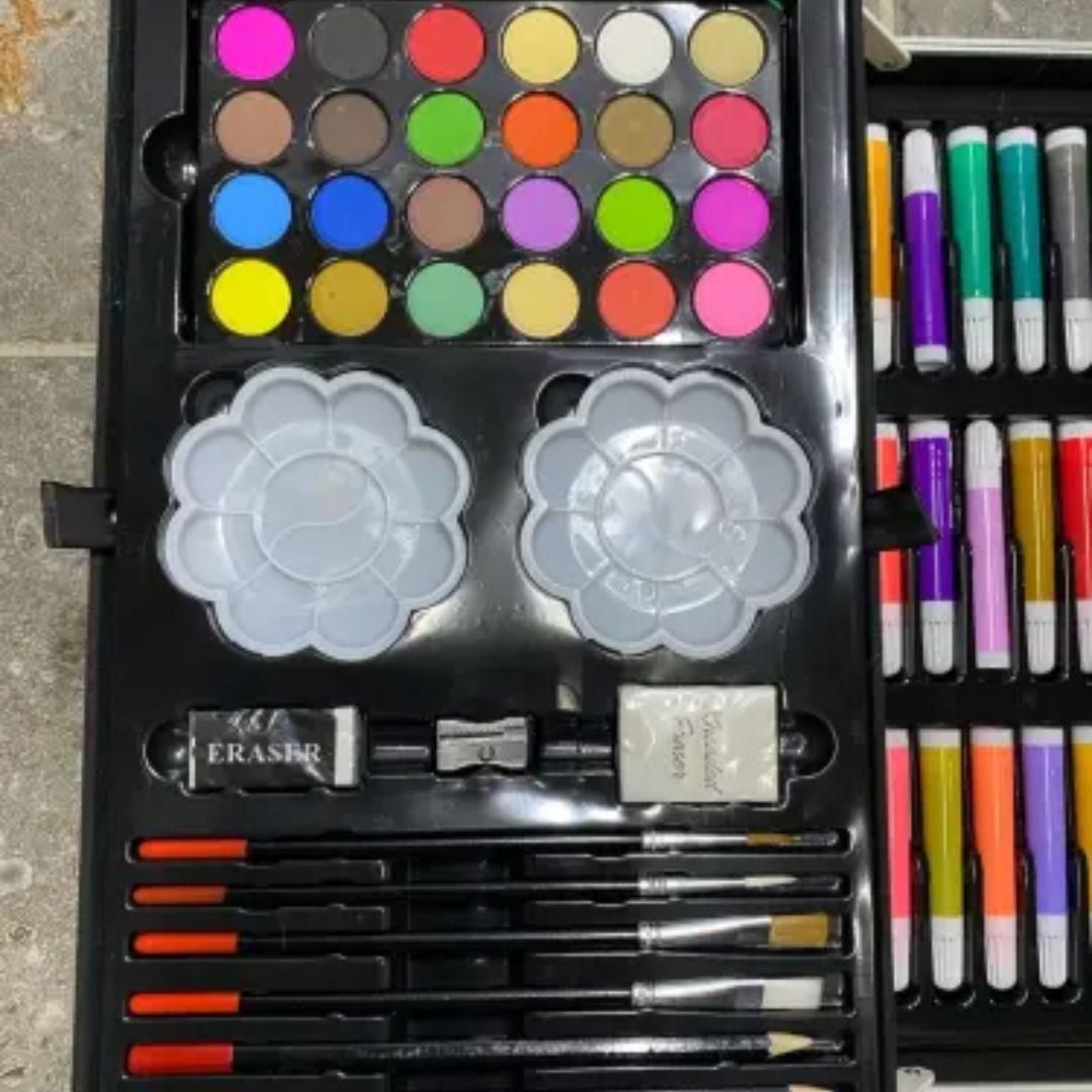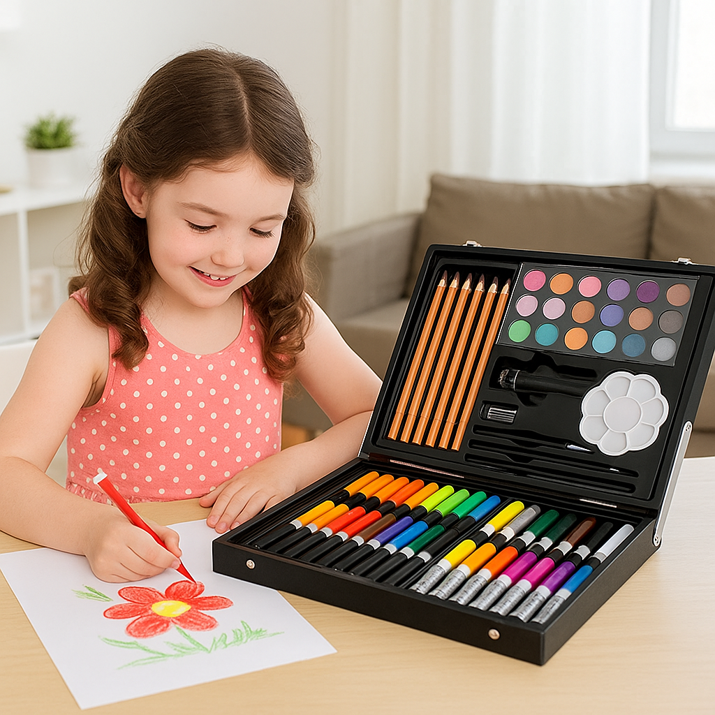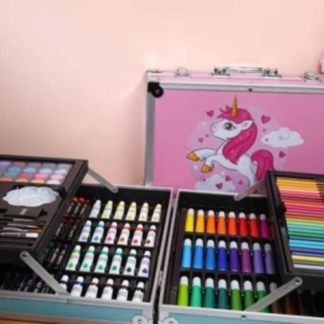 El kit incluye lápices de colores, acuarelas, pasteles al óleo, marcadores, pinceles, paletas de plástico, borradores, sacapuntas y más.