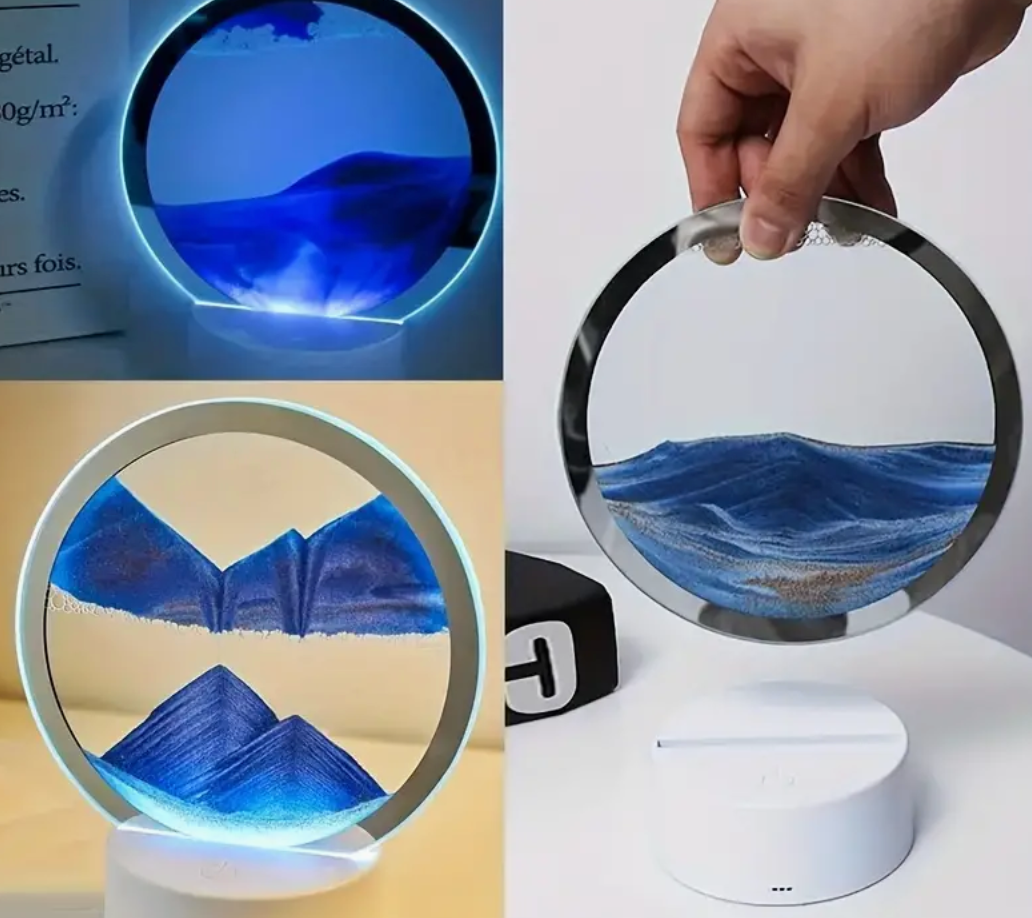 🔶 Arte de Arena 3D en Movimiento: presenta una estructura de arena que se desplaza lentamente, creando paisajes únicos y relajantes cada vez que se gira.