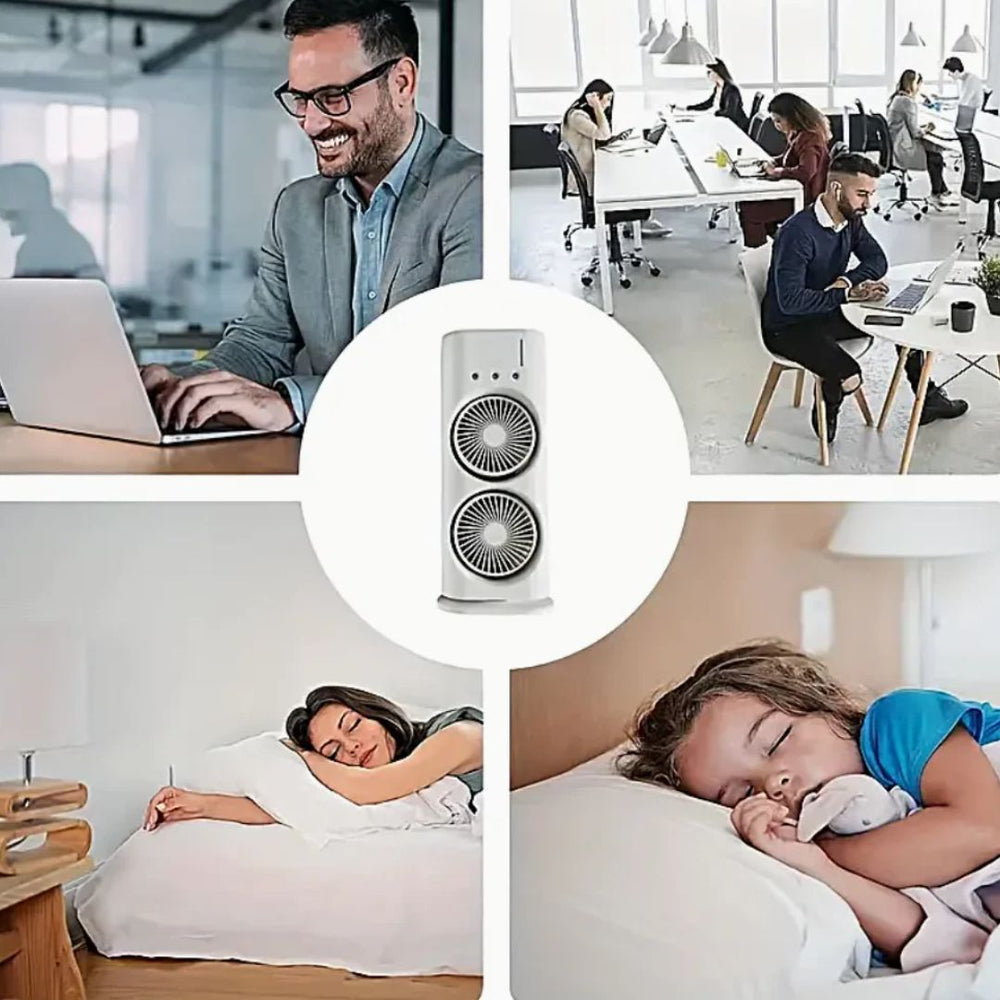 Disfruta de una brisa fresca al momento con este aire acondicionado portátil 3 en 1. Su doble cabezal de pulverización enfría y humidifica tu ambiente rápidamente, brindándote el alivio perfecto en los días calurosos.